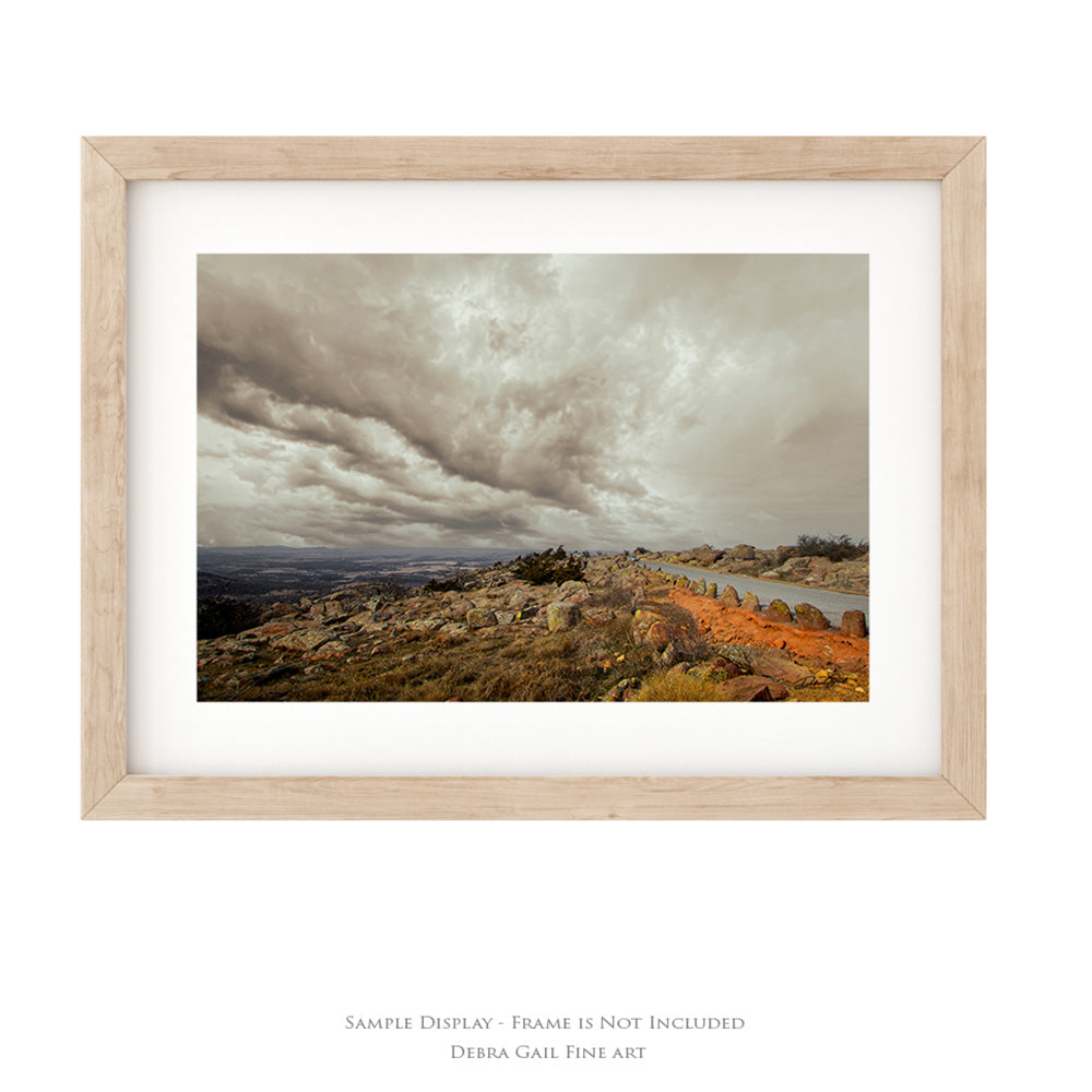 The Oklahoma Mt Scott Stormy Landscape | Rustic Wall Decor captures the dramatic beauty of the Wichita Mountains in Oklahoma, bringing authentic rustic wall decor to your home or office. This horizontal farmhouse wall art features a stormy sky over rugged terrain, delivering a powerful country wall decor statement that transforms any space with natural charm and timeless appeal. Printed on high-quality archival canvas and fine art matte paper, this Oklahoma landscape art offers vivid colors and sharp details that highlight the raw beauty of rural farmhouse art.