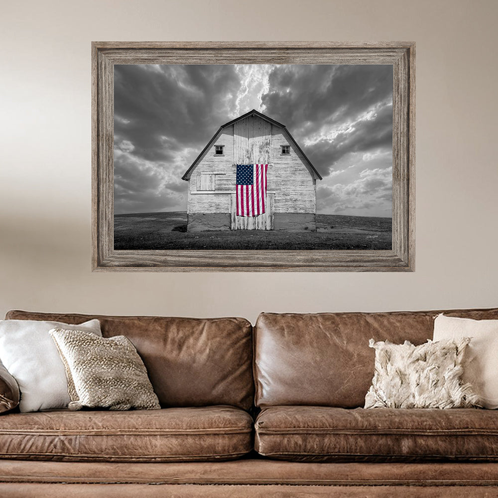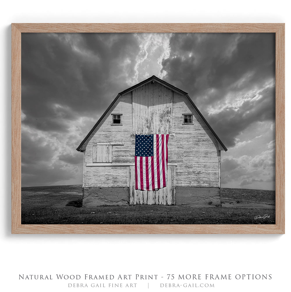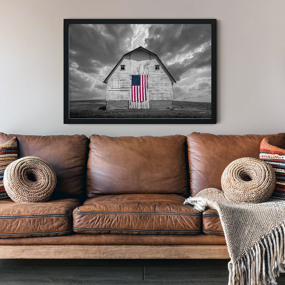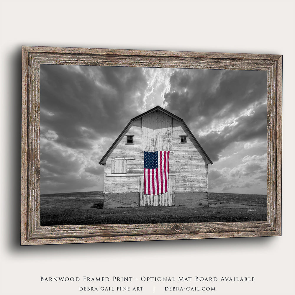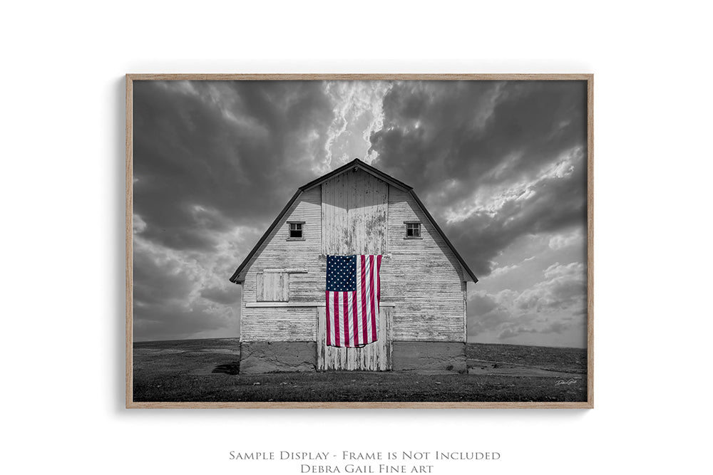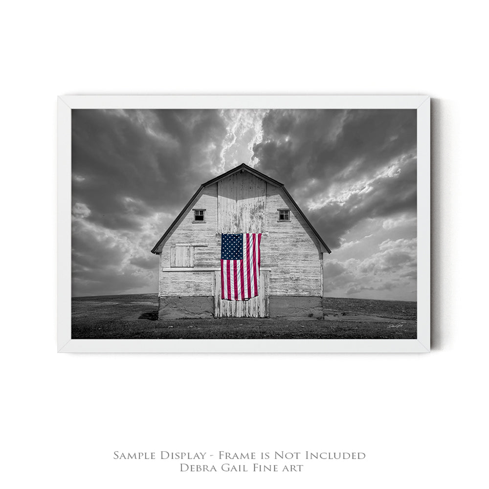 Celebrate the strength and beauty of America with this striking fine art photograph of a weathered barn proudly displaying the American flag. In this unique selective color edition, the barn and dramatic sky are rendered in timeless black and white, while the flag remains in vivid full color — creating a bold and emotional focal point.