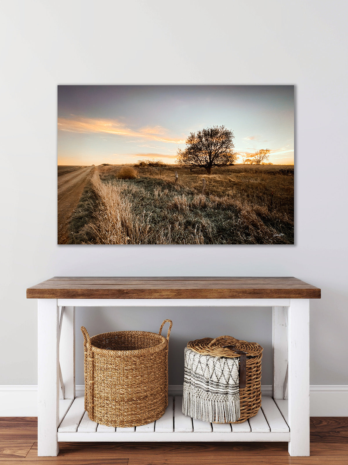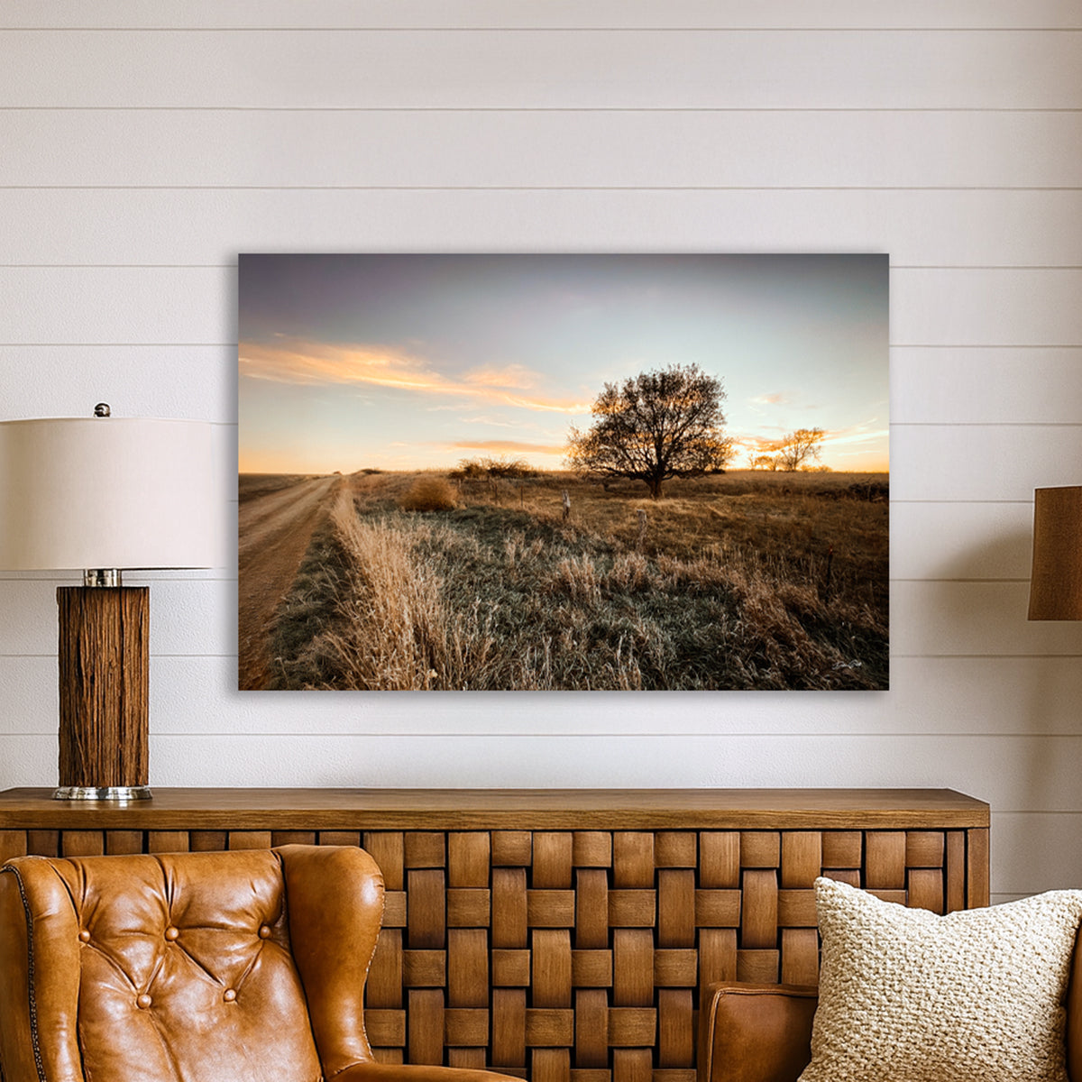 A warm and peaceful Kansas sunset — a quiet dirt road, glowing tree, and soft prairie grasses. Simple, cozy, and perfect for adding a touch of rustic calm to any room. I photographed this image in Kansas.