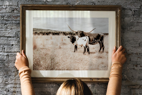 This heartwarming fine art photograph of a Longhorn cow and calf captures the bond of ranch life. Perfect for farmhouse, rustic, and western-inspired interiors, it adds warmth and authenticity to your décor.