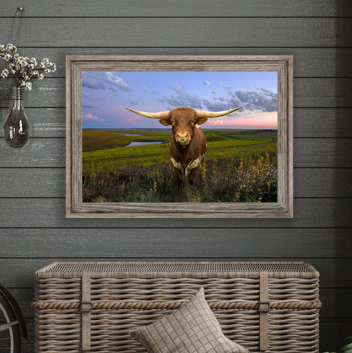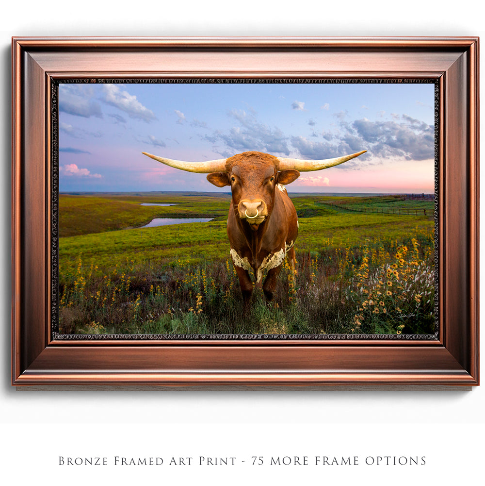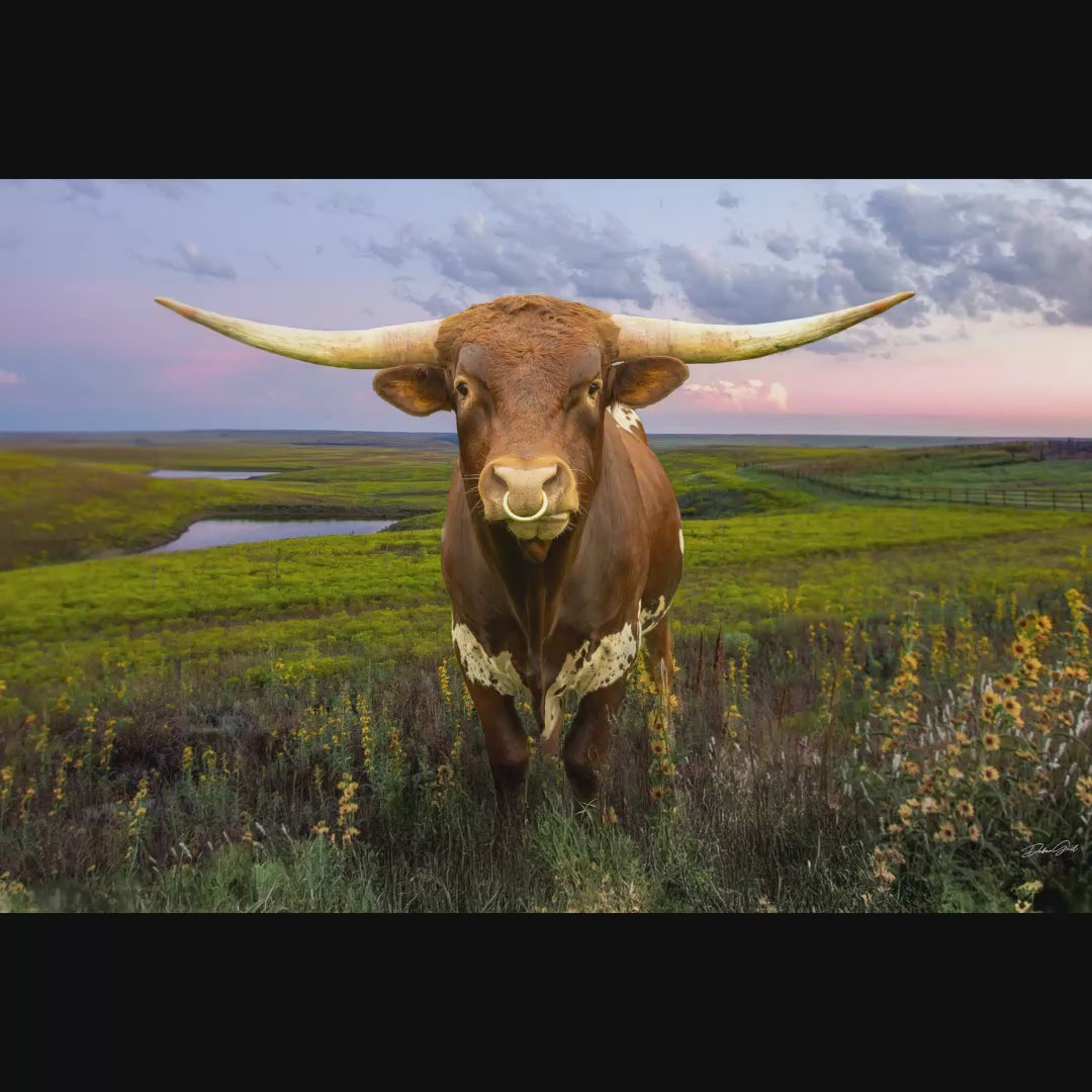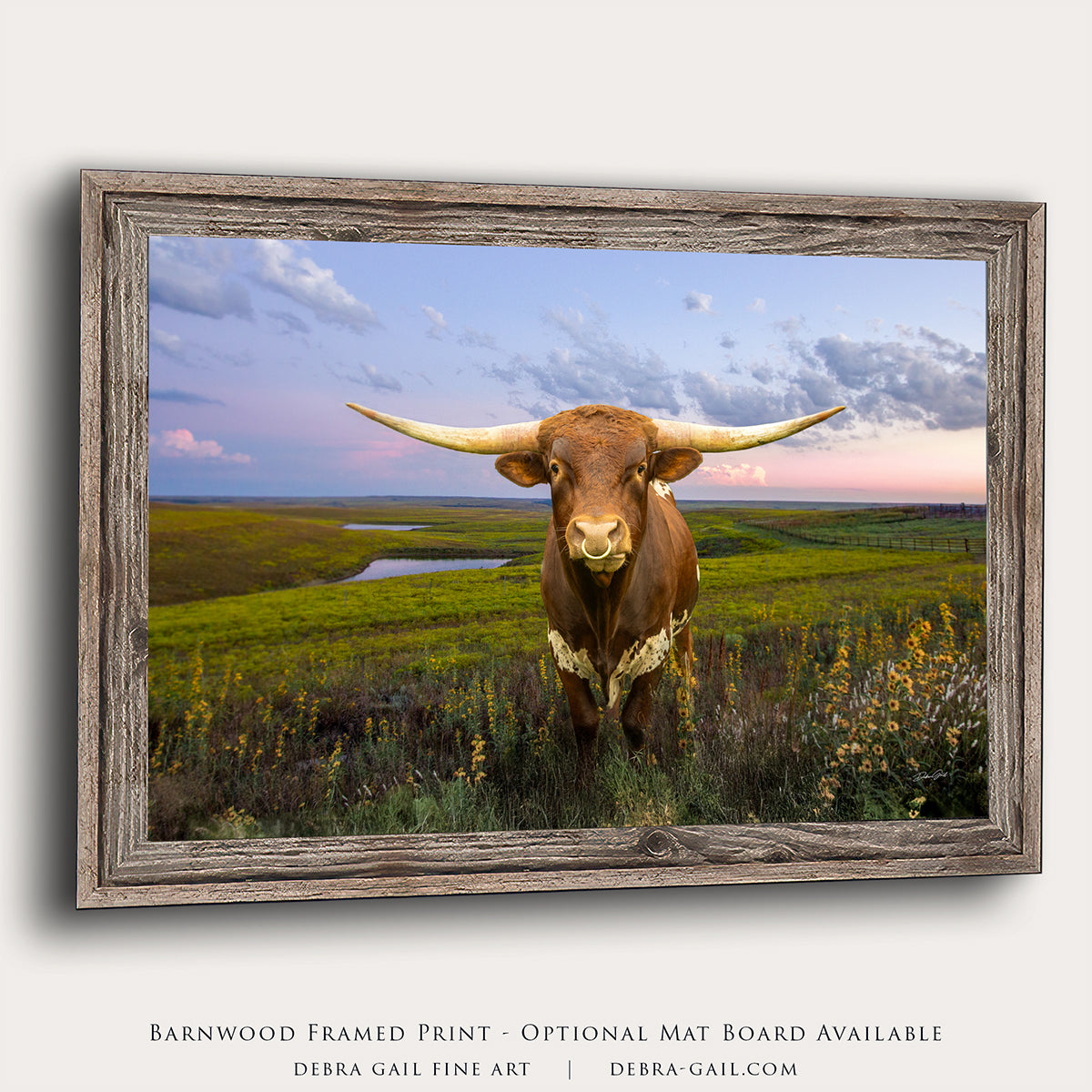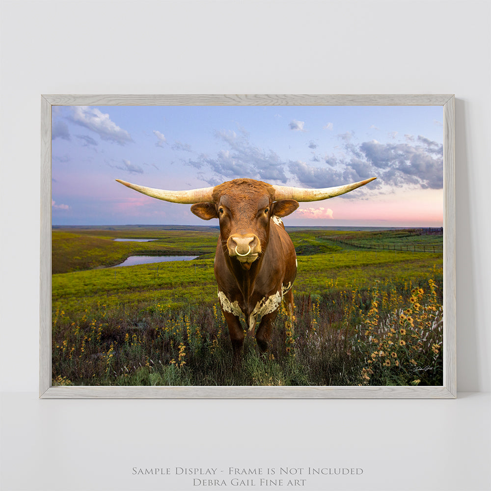 Bring the authentic spirit of ranch life into your home with this natural color portrait of a powerful Texas Longhorn. Photographed against the wide-open Flint Hills prairie, this piece captures the bull’s commanding presence and the beauty of the land itself.