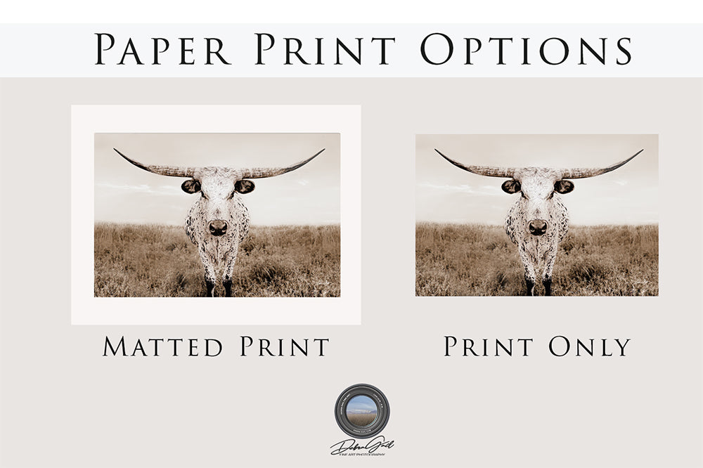 This large longhorn painting features a horizontal orientation and is printed using pigment-based inks on archival matte fine art paper. The gallery mount fine art print option offers a clean, modern presentation on a rigid backing with a non-reflective finish that eliminates glare, making it perfect for well-lit rooms. Alternatively, the fine art print (unframed) option allows collectors to choose their own framing, ideal for display behind glass or acrylic.