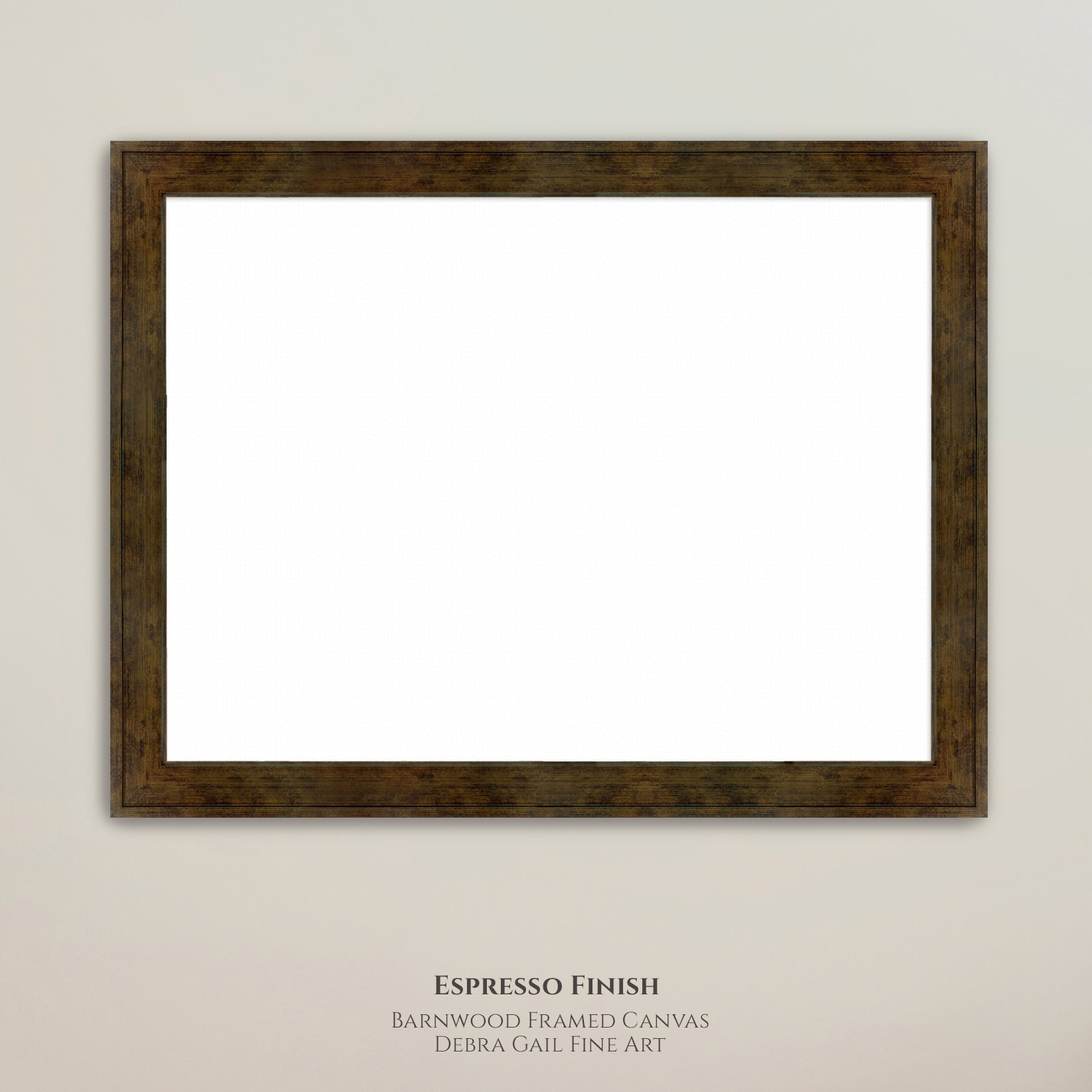 Barnwood-framed pieces are offered in a curated Driftwood Gray finish, selected for its neutral tone and versatility across a wide range of artwork and interior styles. Additional barnwood finishes, including whitewashed or espresso tones, may be available upon request. Please contact me prior to ordering if you would like to explore custom barnwood options.