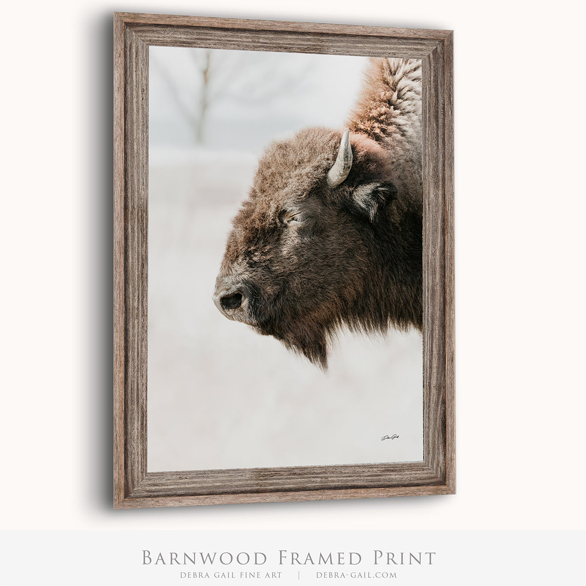 Bring the quiet strength of the American plains into your home with this fine art photograph of a majestic bison, captured in winter’s soft, muted light. Against a pale, snowy backdrop and a faint tree silhouette, the bison’s thick fur and powerful hump stand out with striking detail. The minimal yet dramatic composition makes this print a timeless choice for farmhouse, rustic, and Western-inspired interiors.