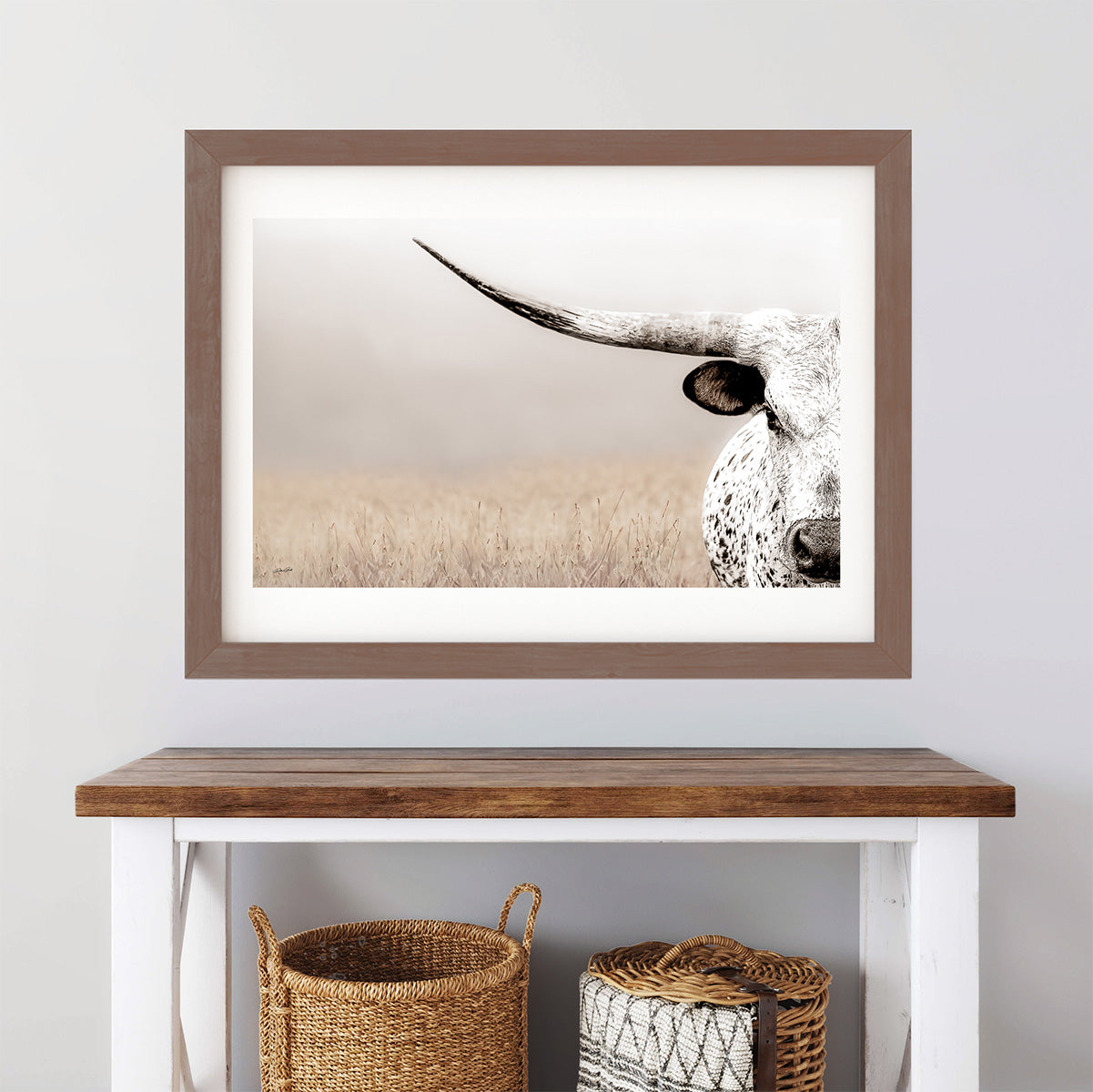 The Texas Longhorn photography showcases the unique textures and colors of this iconic breed, making it an ideal piece of real longhorn decor. Its horizontal orientation fits perfectly in modern rustic wall art collections or as a centerpiece in rustic farmhouse decor schemes.