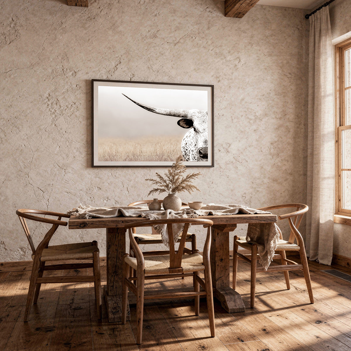 This longhorn wall art piece is more than just a cow canvas print; it is a celebration of Texas heritage and rustic charm. Whether enhancing your living room, office, or restaurant space, this extra large cow print elevates any environment with its bold presence and authentic western decor art style. Its combination of modern rustic wall art aesthetics with traditional ranch imagery makes it a standout addition to your farmhouse wall decor collection.
