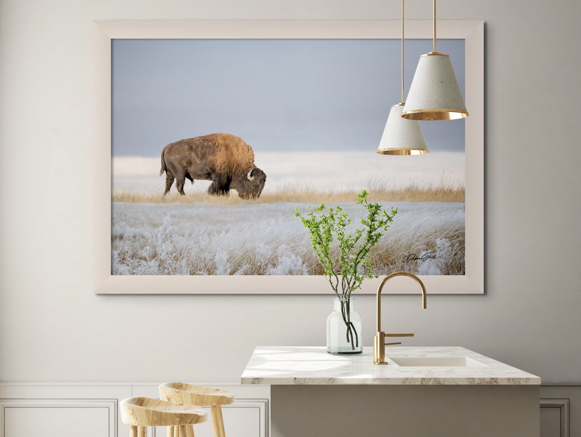 Celebrate the enduring spirit of the American Bison with this fine art photograph. Perfect for farmhouse, rustic, and western décor, it adds bold prairie character to any room. No. 3023.