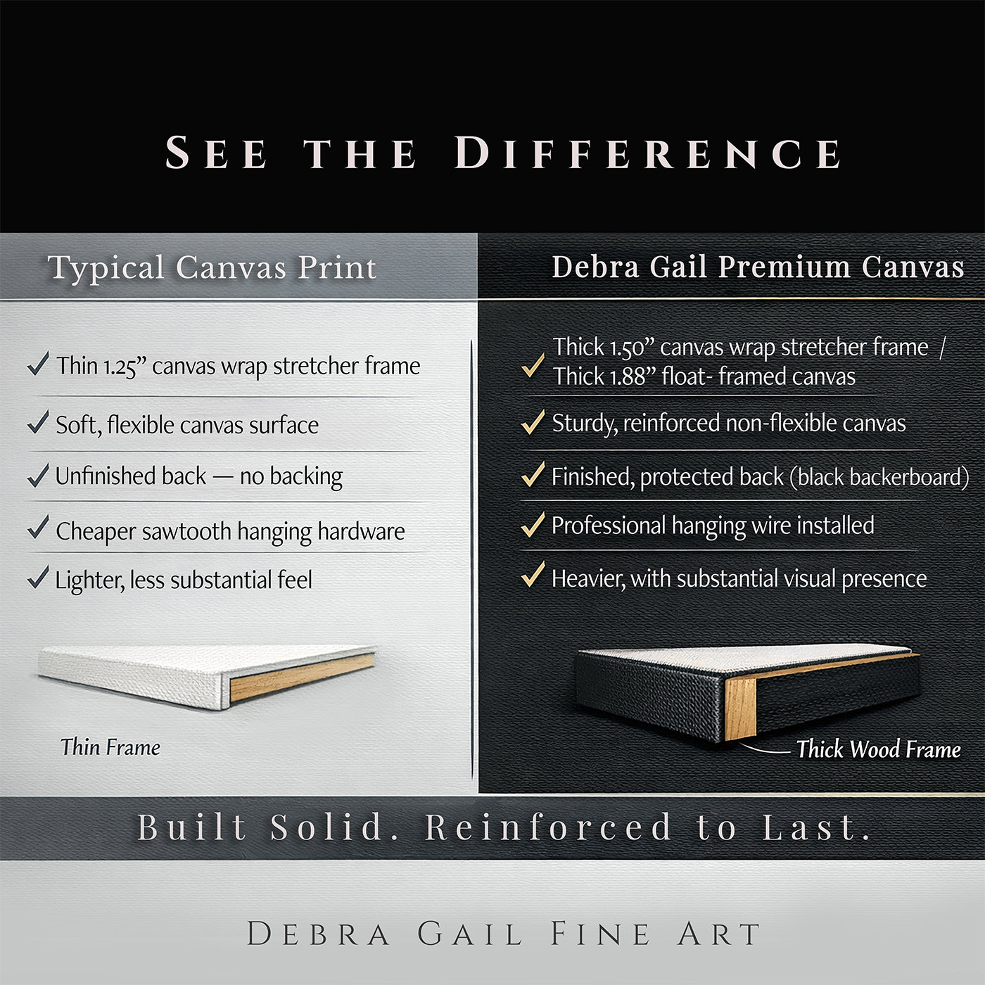 Available finishes include fine art paper, gallery-wrapped canvas, and framed options, depending on the piece. Canvas artwork is professionally constructed and arrives ready to hang. Framed and print options are prepared with the same attention to detail and presentation.
