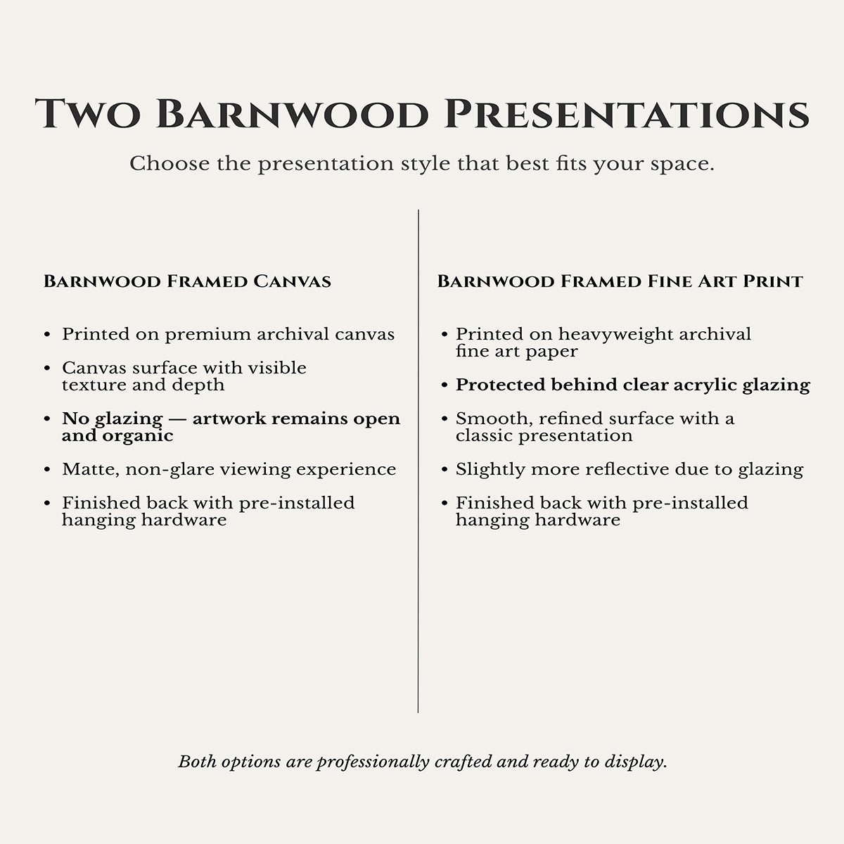 Barnwood-framed pieces are offered in a curated Driftwood Gray finish, selected for its neutral tone and versatility across a wide range of artwork and interior styles. Additional barnwood finishes, including whitewashed or espresso tones, may be available upon request. Please contact me prior to ordering if you would like to explore custom barnwood options.