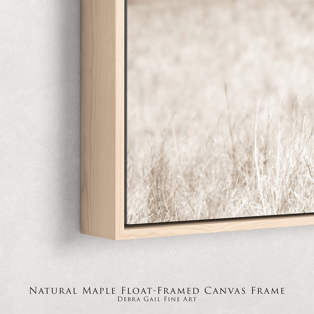Float-framed canvas pieces are offered in a carefully selected Natural Maple, Black, or Brown finish. These options are chosen to provide clean, modern contrast while allowing the artwork to remain the focal point. If you’re unsure which frame best suits your space, I’m happy to help guide your selection.
