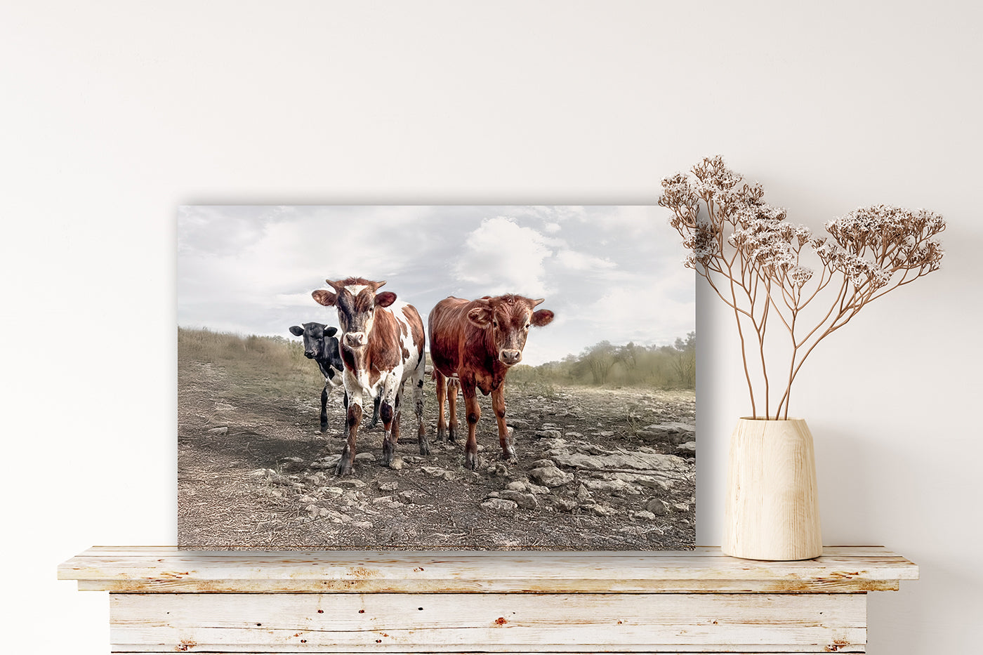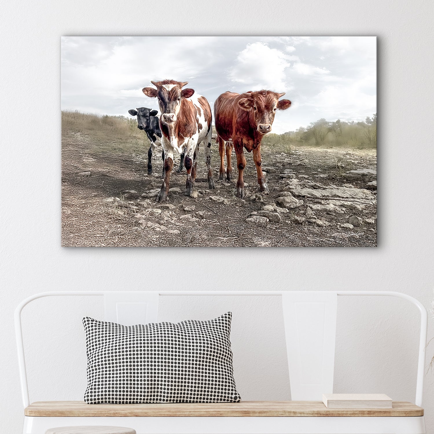 This Longhorn cow print captures the charm of Texas Longhorn calves in a rustic canvas art piece perfect for farmhouse wall art and nursery decor. Featuring a close-up photo of speckled baby calves against a soft sky, this large cow canvas delivers a cozy, country wall decor vibe that enhances any room with Western cattle painting style. Photographed in Kansas by Debra Gail Fine Art, this horizontal artwork blends rustic nursery decor with authentic Western ranch photography.