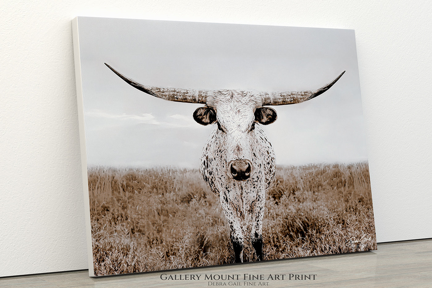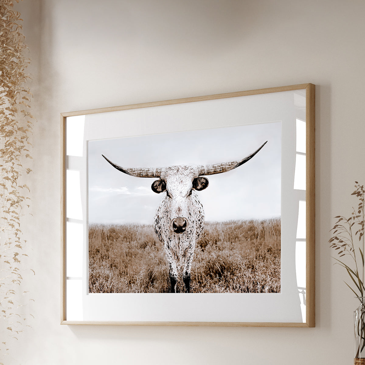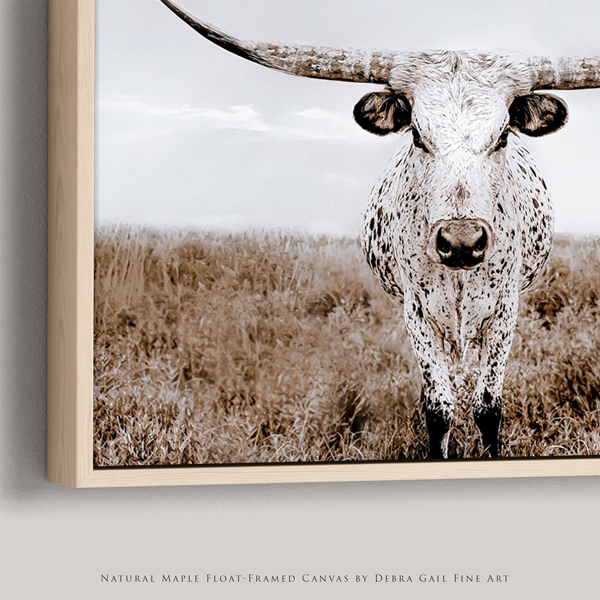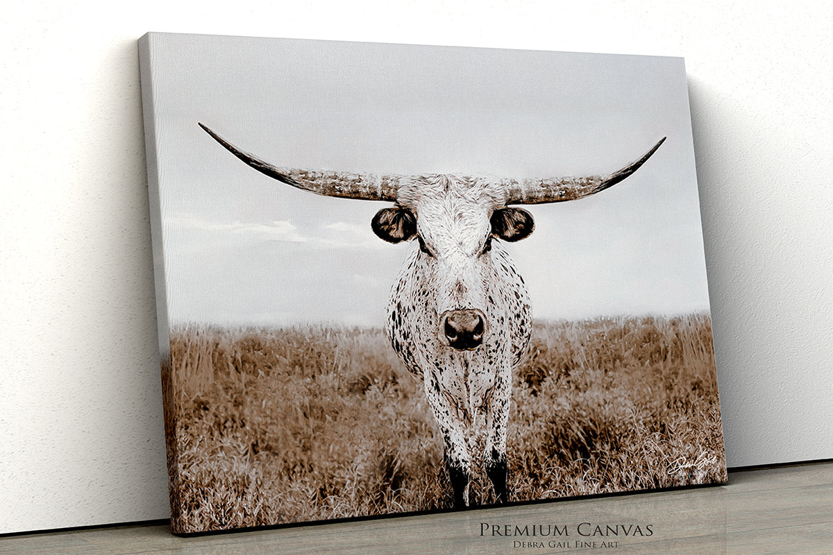 This large Texas Longhorn wall art captures the rugged beauty and quiet strength of an iconic symbol of the American West. Created as a fine art photograph and printed on premium archival materials, this rustic canvas artwork is designed to bring warmth, character, and Western authenticity into your space.