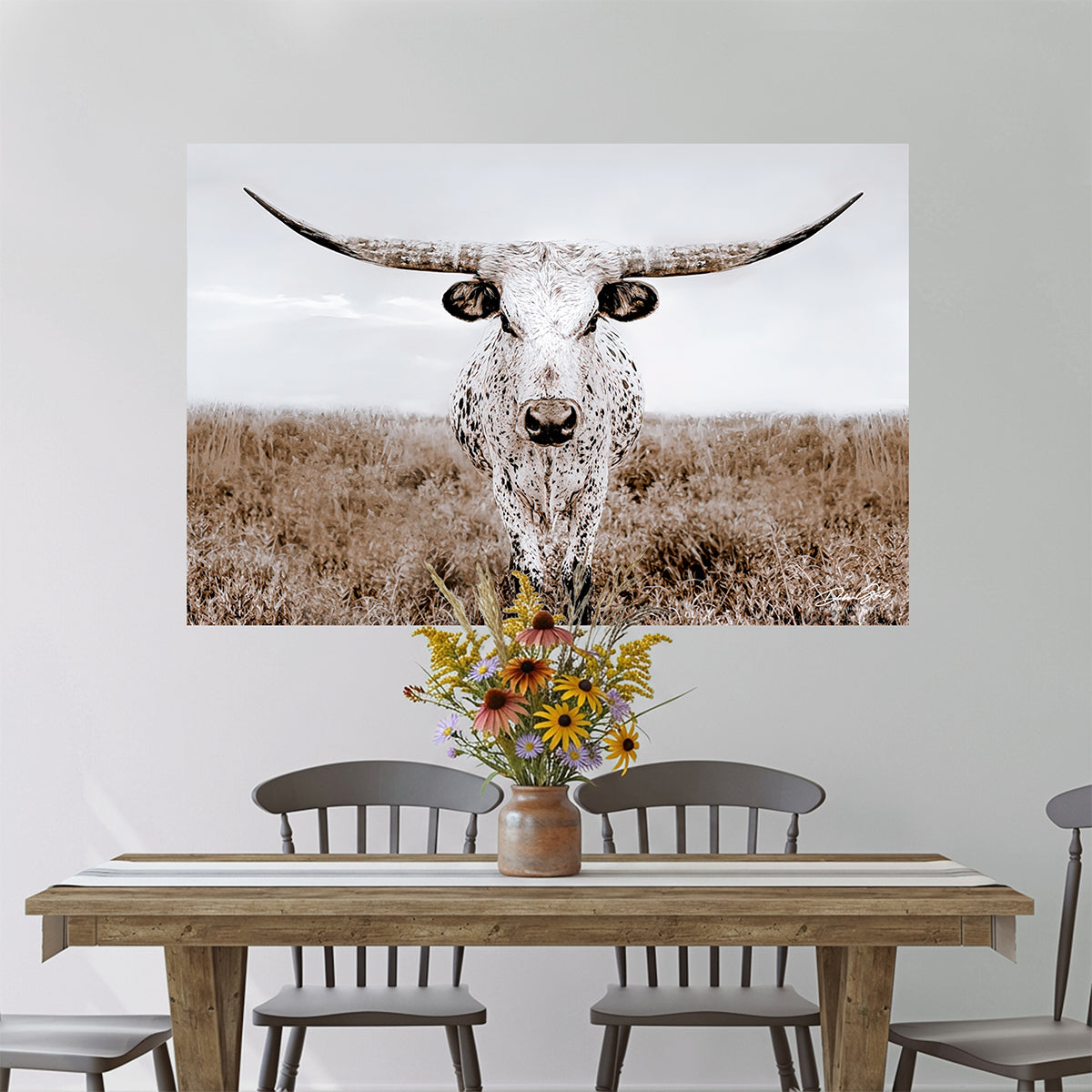 The wide-format composition highlights the sweeping horns and textured details of the Longhorn, making this piece especially well suited for farmhouse interiors, ranch homes, and Western-inspired spaces. Its natural tones and rustic aesthetic pair beautifully with wood accents, neutral palettes, and country-style décor.